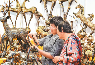 9月23日,在廣西南寧舉行的第十六屆中國—東盟博覽會上,“一帶一路”相關(guān)國家的參展商帶來的商品吸引眾多參觀者前來選購。圖為參觀者在南寧國際會展中心選購巴基斯坦青銅器。新華社記者 曹祎銘 攝