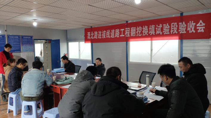 與會人員按程序對翻挖換填試驗段的現場施工質量情況進行了詳細察看;隨后,在溉北路連接線道路工程項目部現場辦公室對其質量進行了客觀評定。