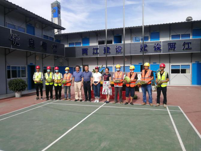 李寧董事長將解暑慰問品親自送到項目部員工及一線工人代表手上,并叮囑項目管理人員要嚴格執行高溫室外作業錯時施工的相關規定,要“以人為本”落實高溫天氣作業安全防范措施,切實做好當前防暑降溫工作,防止工人中暑,確保安全。在歡聲笑語中,工人們接過慰問品,感謝之情溢于言表,絲絲清涼暖人心。