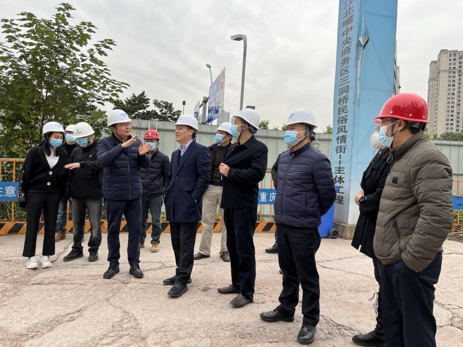 11月9日上午,江北嘴集團副總經理尹曉華一行來到由兩江建設公司承建的重慶寸灘國際新城展示中心項目及三洞橋風情街項目檢查指導工作。兩江建設公司董事長盧明、總經理李斌、監事長張青、副總經理丁玉海陪同檢查。