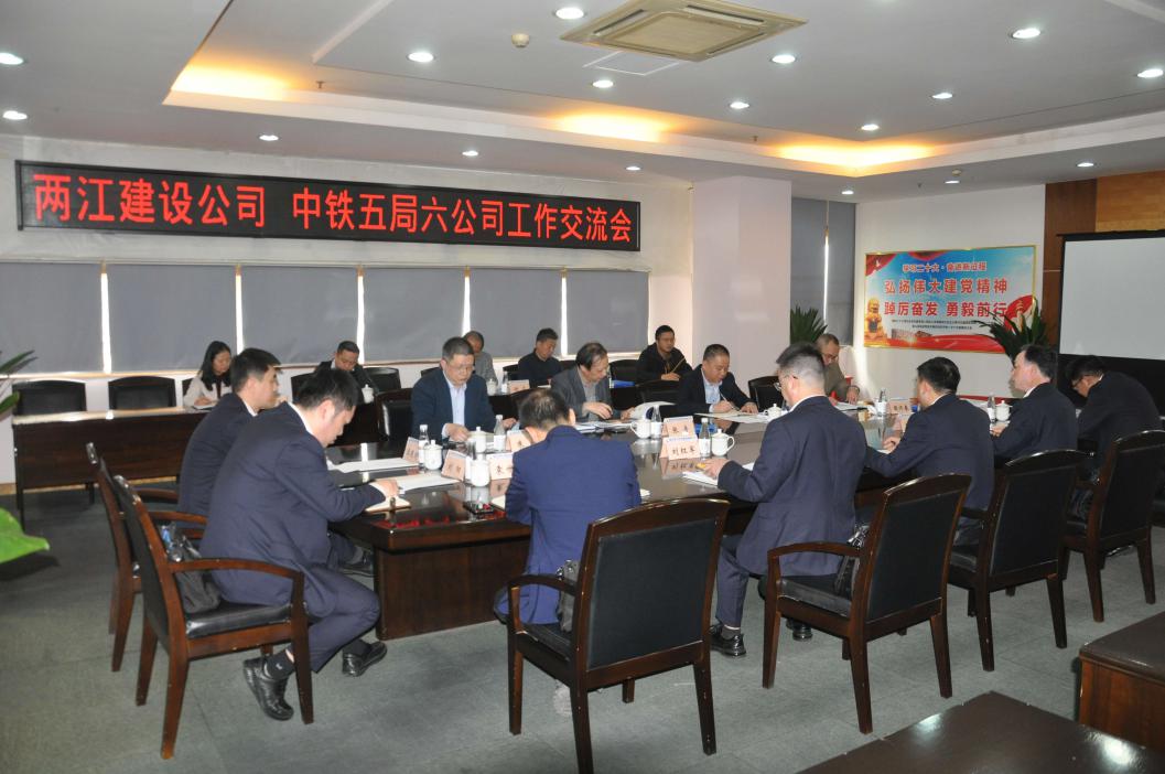 中鐵五局六公司總會計師劉紅軍,副總經濟師林平、袁世全,副總工程師舒建及相關部門負責人;兩江建設公司監事長張青,副總經理樊懷春、朱靖,綜合辦公室、市場營銷部、工程管理部、成本控制部相關負責人參加交流。