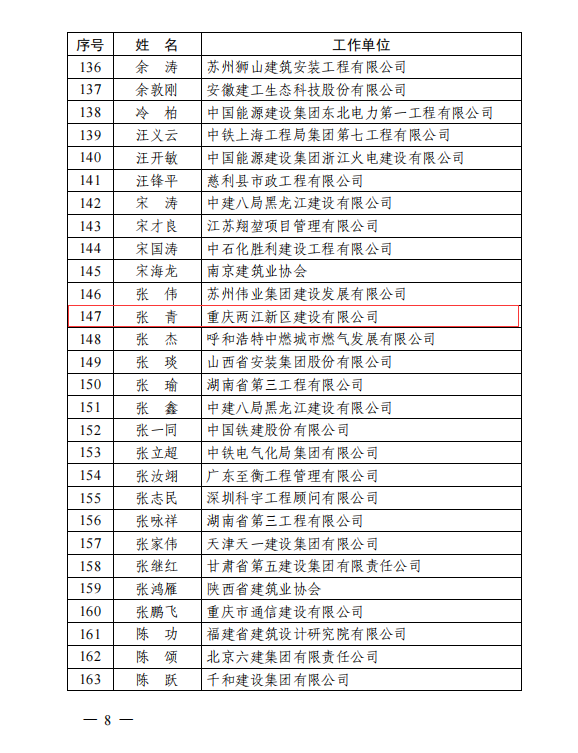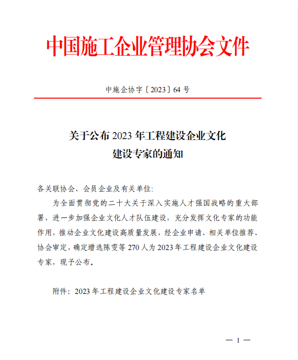 近日,中國施工企業(yè)管理協(xié)會發(fā)布了《關(guān)于公布 2023 年工程建設(shè)企業(yè)文化建設(shè)專家的通知》,重慶兩江新區(qū)建設(shè)有限公司公司監(jiān)事會主席張青同志受聘“工程建設(shè)企業(yè)文化建設(shè)專家”。